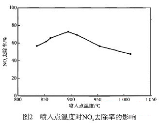 在氨水質(zhì)量分數(shù)為13.0%、噴人點溫度為894℃、霧化壓力為0.35 MPa的條件下,n(NH ):n(NOx)對NOx去除率的影響見圖3。由圖3可見,隨即(NH3): (NOx)的增加,NO 去除率逐漸增加。這是因為隨n(NH3):n(NOx)的增加,有更多的還原NNH3可以與NO反應(yīng),NOx去除率增加;繼續(xù)增加n(NH ):n(NOx),N0x去除率增加緩慢,這是因為煙氣中大部分NO已被還原,反應(yīng)物NO濃度降低,反應(yīng)速率變慢。因此,綜合考慮經(jīng)濟因素,試驗選擇n(NH3):n(N0x)為1.2。
