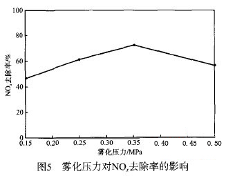 在氨水質(zhì)量分數(shù)為13.0%、噴人點溫度為894℃、n(NH3):n(NOx)為1.2的條件下,霧化壓力對NOx去除率的影響見圖5。