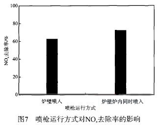 氨水與煙氣的充分、均勻混合是保證高NOx去除率的又一技術(shù)關(guān)鍵。在氨水質(zhì)量分數(shù)為13.O%、噴入點溫度為894℃、n(NH3):n(NOx)為1.2、霧化壓力為0.35 MPa的條件下,分別采用爐壁噴入和爐壁爐內(nèi)同時噴人兩種方式噴入氨水,噴槍運行方式對N0x去除率的影響見圖7。由圖7可見,當噴槍采用爐壁爐內(nèi)同時噴入的運行方式時,NOx去除率明顯提高。這是因為分解爐的直徑較大,采用爐壁爐內(nèi)同時噴人的運行方式可以使氨水與煙氣接觸得更加充分、均勻。因此,在水泥窯SNCR脫硝工藝運行時,應(yīng)根據(jù)不同爐型的結(jié)構(gòu)特點,合理布置噴射點位,調(diào)整噴槍運行方式,以實現(xiàn)氨水與煙氣的充分、均勻混合。